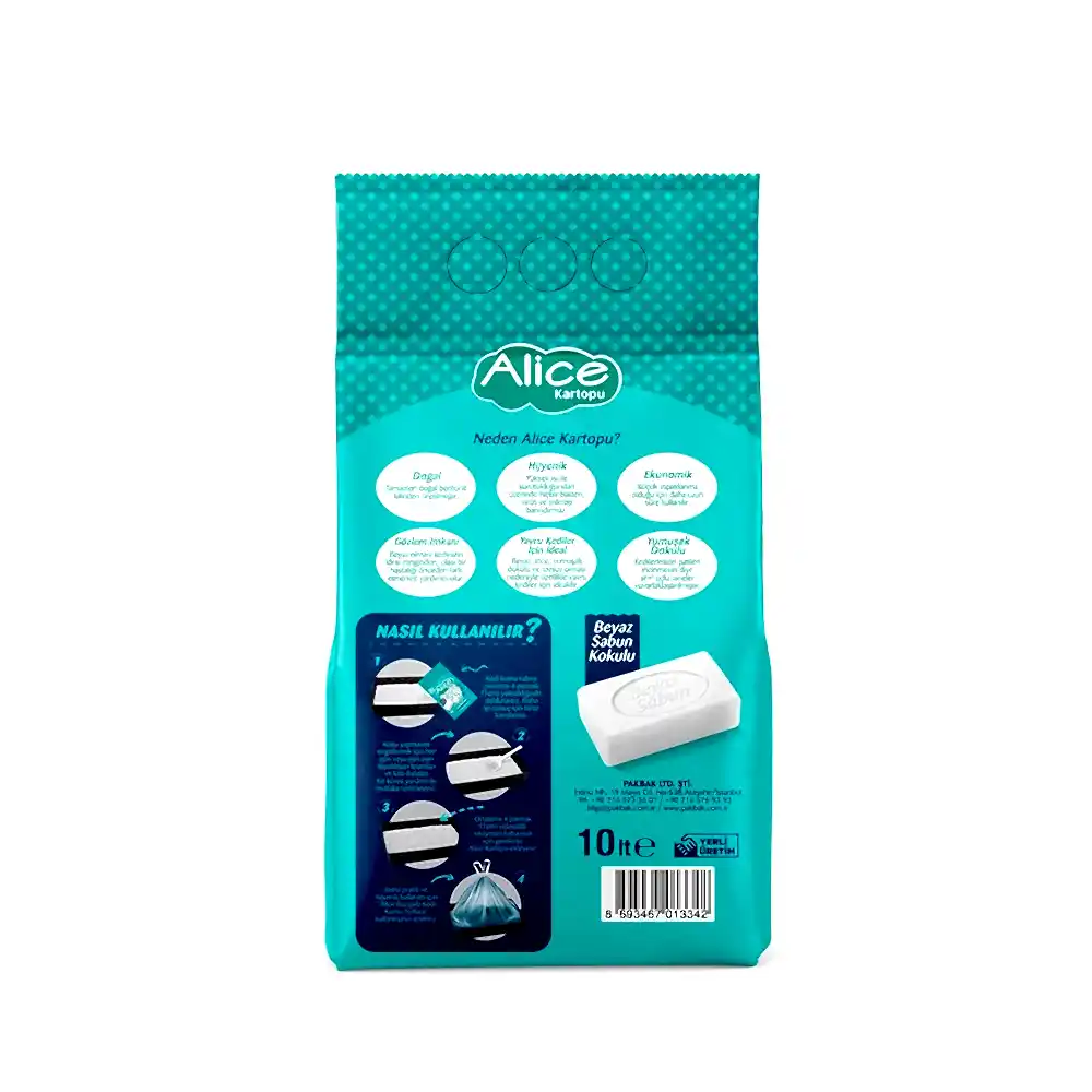 Alice Kartopu İnce Taneli Topaklaşan Sabun Kokulu Kedi Kumu Tamamen doğal, beyaz bentonit mineralinden üretilmiştir, üzerinde hiçbir bakteri ve mikrop barındırmaz. Kedi idrarı ile karşılaşınca hızla topaklanır, güzel beyaz sabun kokusu yayar. Kedi tuvaletinden kaynaklanan kötü kokuları ortamdan emer.