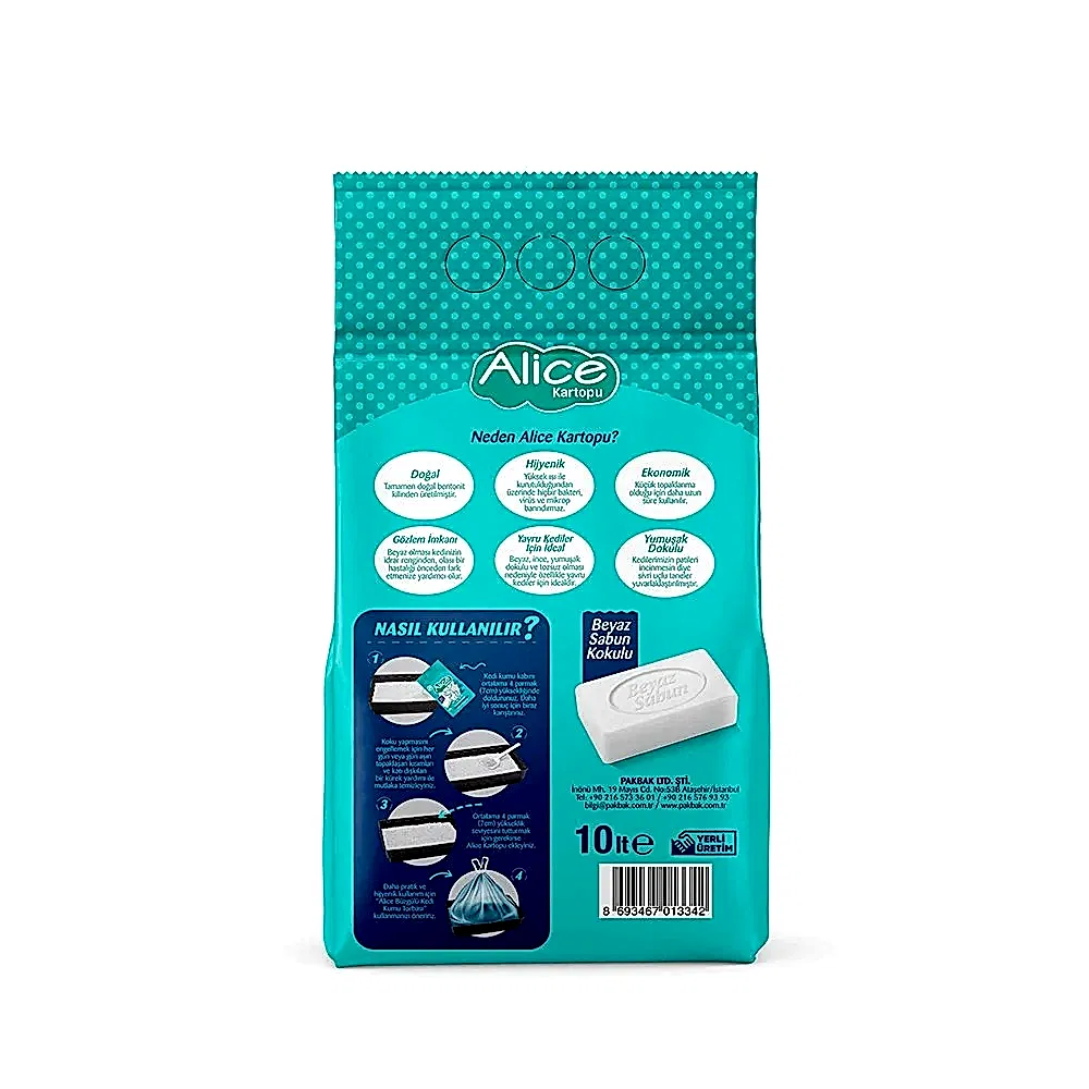 Alice Kartopu İnce Taneli Topaklaşan Sabun Kokulu Kedi Kumu Tamamen doğal, beyaz bentonit mineralinden üretilmiştir, üzerinde hiçbir bakteri ve mikrop barındırmaz. Kedi idrarı ile karşılaşınca hızla topaklanır, güzel beyaz sabun kokusu yayar. Kedi tuvaletinden kaynaklanan kötü kokuları ortamdan emer.
