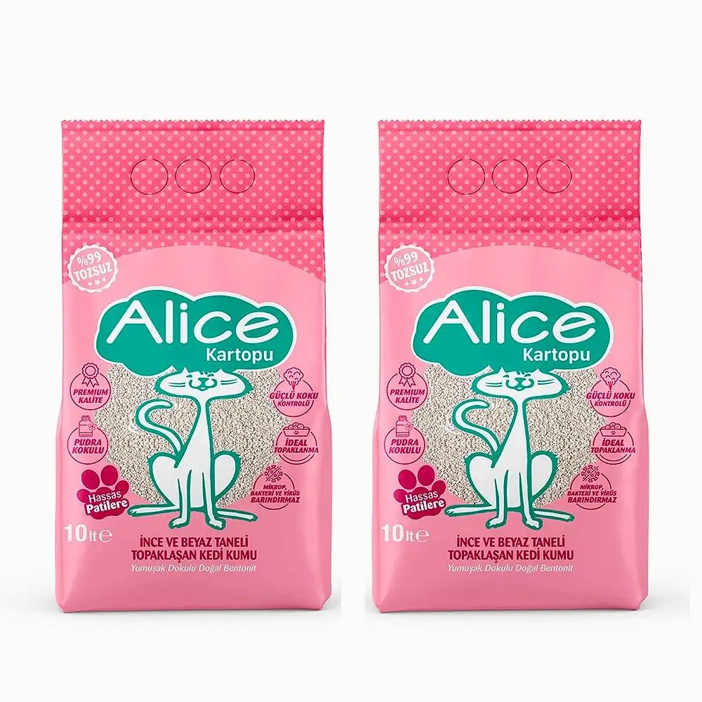 Alice Kartopu İnce ve Beyaz Taneli Pudra Kokulu Kedi Kumu 2×10 lt.