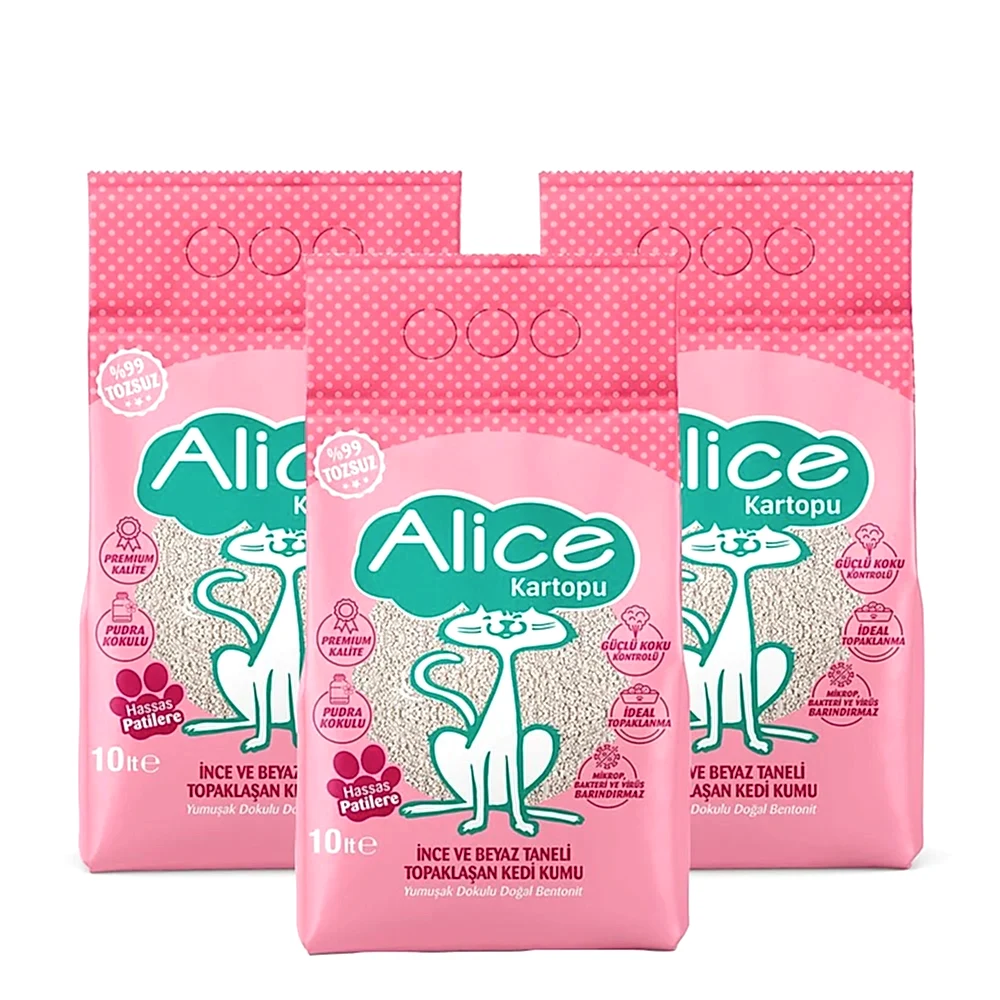 Alice Kartopu İnce ve Beyaz Taneli Pudra Kokulu Kedi Kumu 3×10 lt.