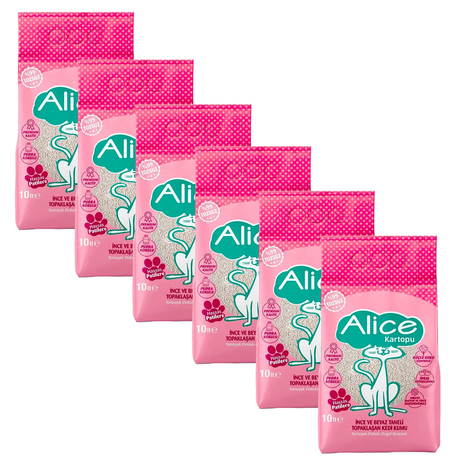 Alice Kartopu İnce ve Beyaz Taneli Pudra Kokulu Kedi Kumu 6×10 lt.