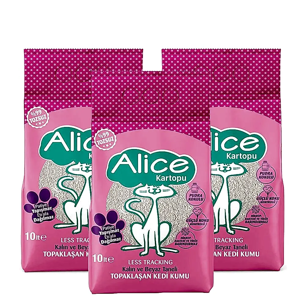 Alice Kartopu Kalın ve Beyaz Taneli Pudra Kokulu Kedi Kumu 3×10 lt.