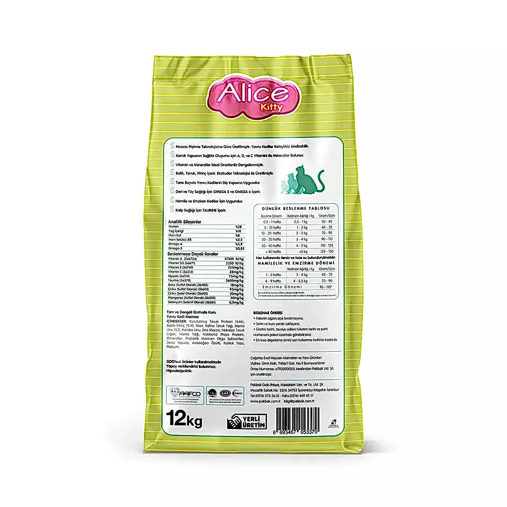 Alice Kitty Yavru Kediler için kedi maması sütten kesilmiş yavrunun 12. ayına kadar kas, iskelet ve zihin gelişimi için gerekli olan tüm besin ve vitaminleri dengeli olarak sunar. Tavuk, hamsi ve karides içeriğinden gelen yüksek protein oranının yanı sıra Omega-3 ve Omega-6 yağ asitleri sayesinde yavru kediniz sağlıklı deri ve parlak tüylere sahip olur. İçerisindeki prebiyotikler, kızılcık tozu ve vitaminler yavru kedinizin güçlü bir bağışıklık ile hastalanmadan büyümesine destek olur.