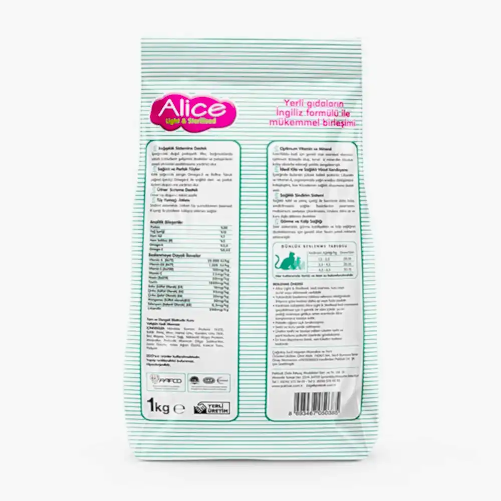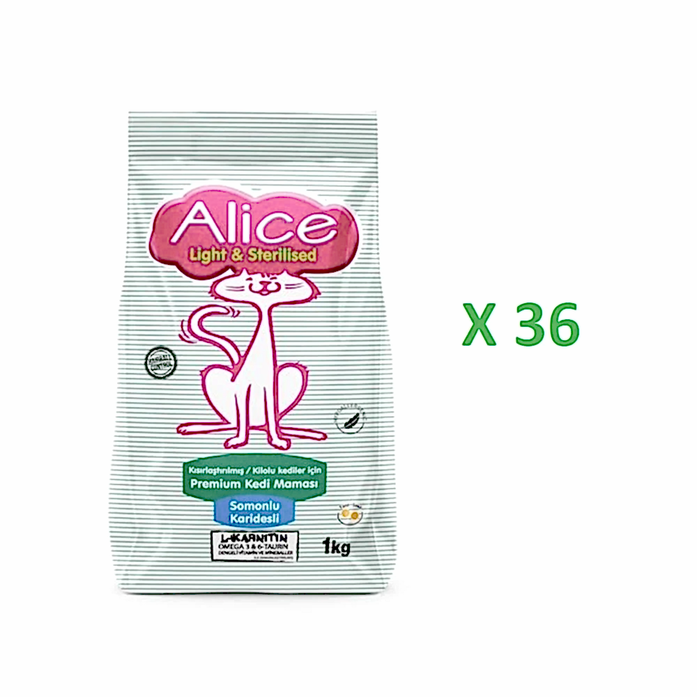 Alice Light & Sterilised – Kısırlaştırılmış / Kilolu Kediler İçin Super Premium Mama Somonlu Karidesli 1 kg x 36 Adet (3 koli)(GEL-AL ÜRÜNÜDÜR, KARGOLANMAZ)