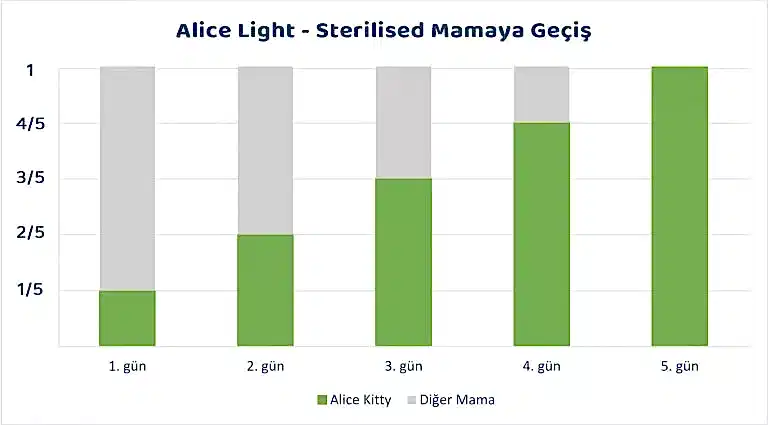 Kedinizin kolaylıkla Alice Light & Sterilised Kedi Mamasına geçebilmesi için 5 günlük bir süre içinde şu an yediği mamaya gittikçe artan oranlarda Alice Light & Sterilised karıştırmanız tavsiye edilir.