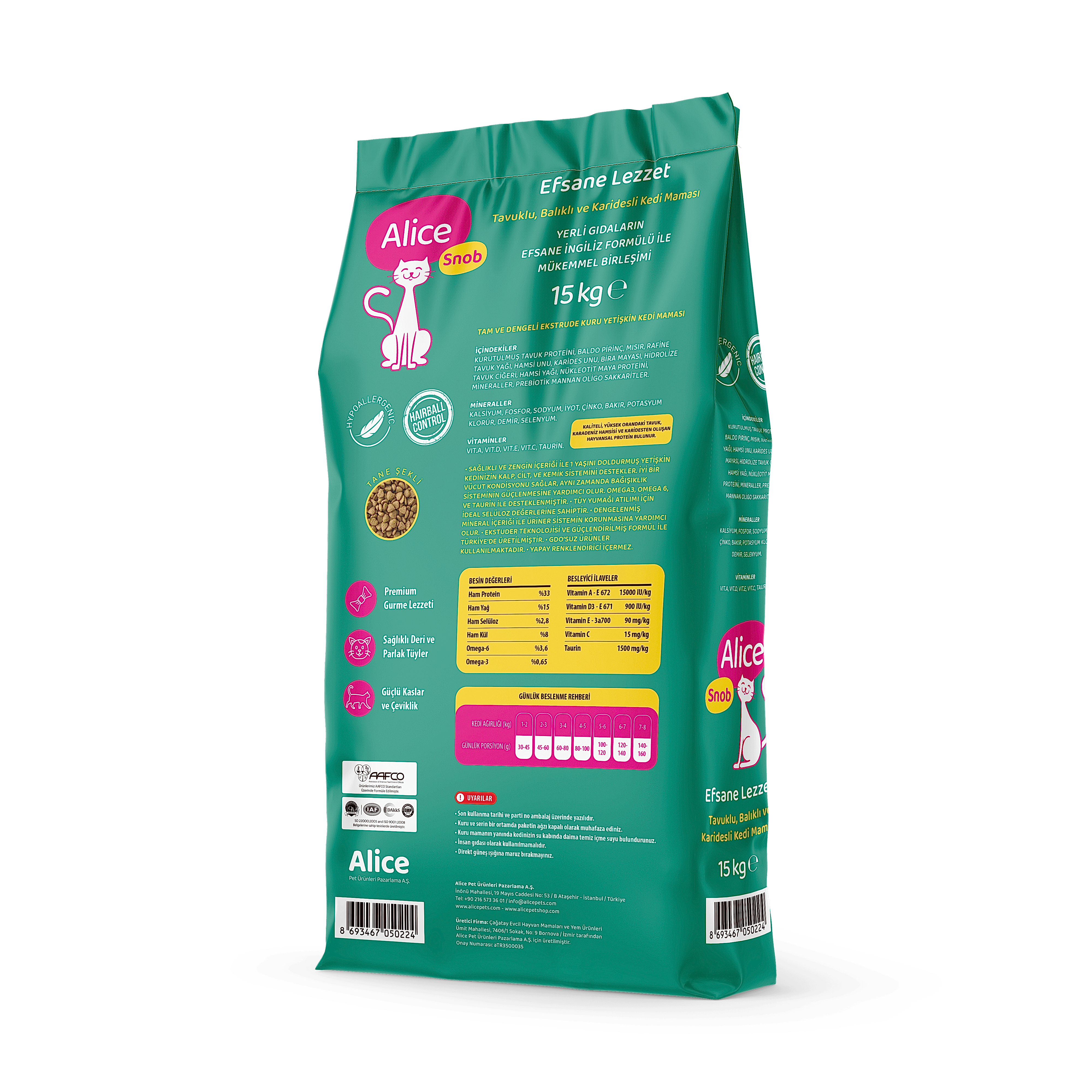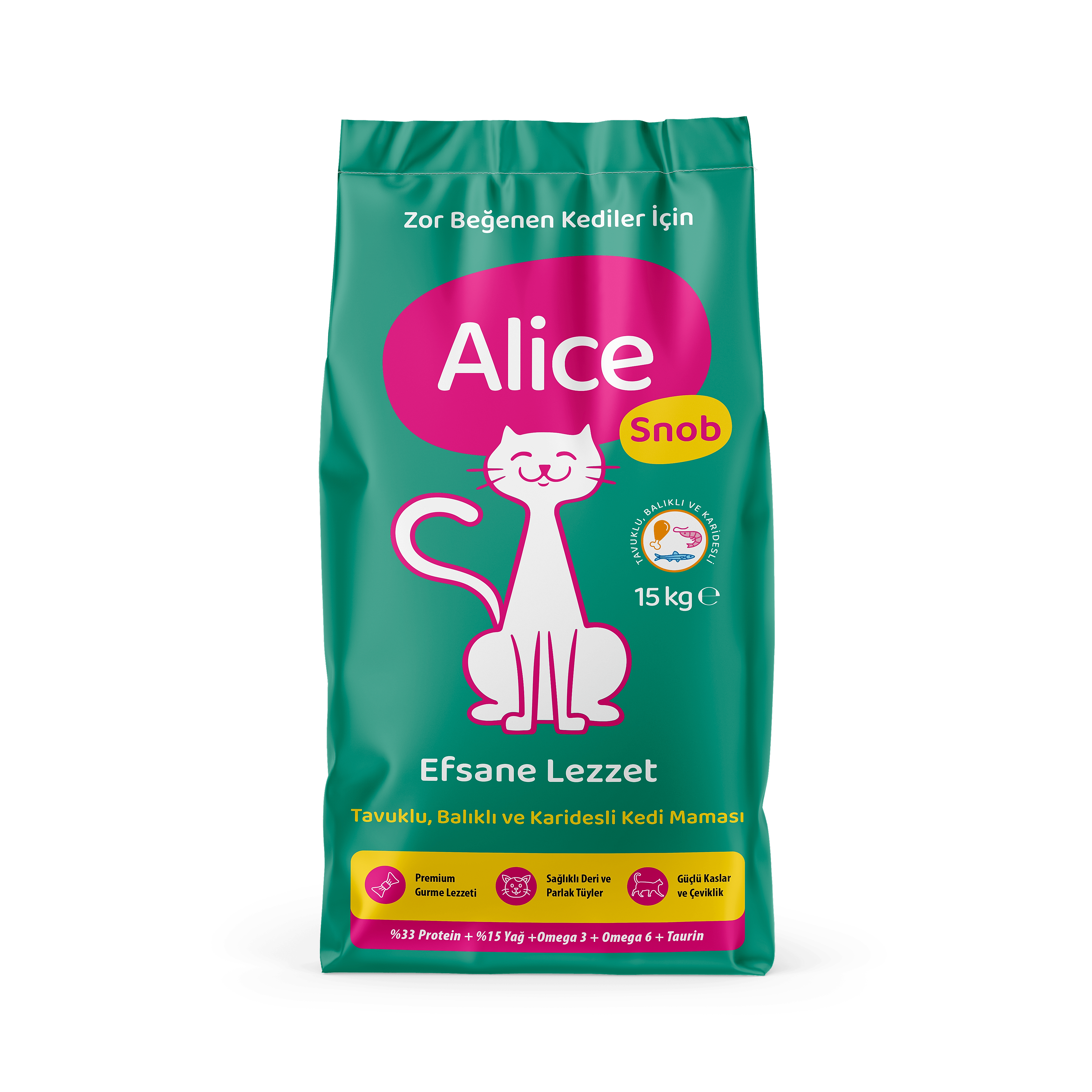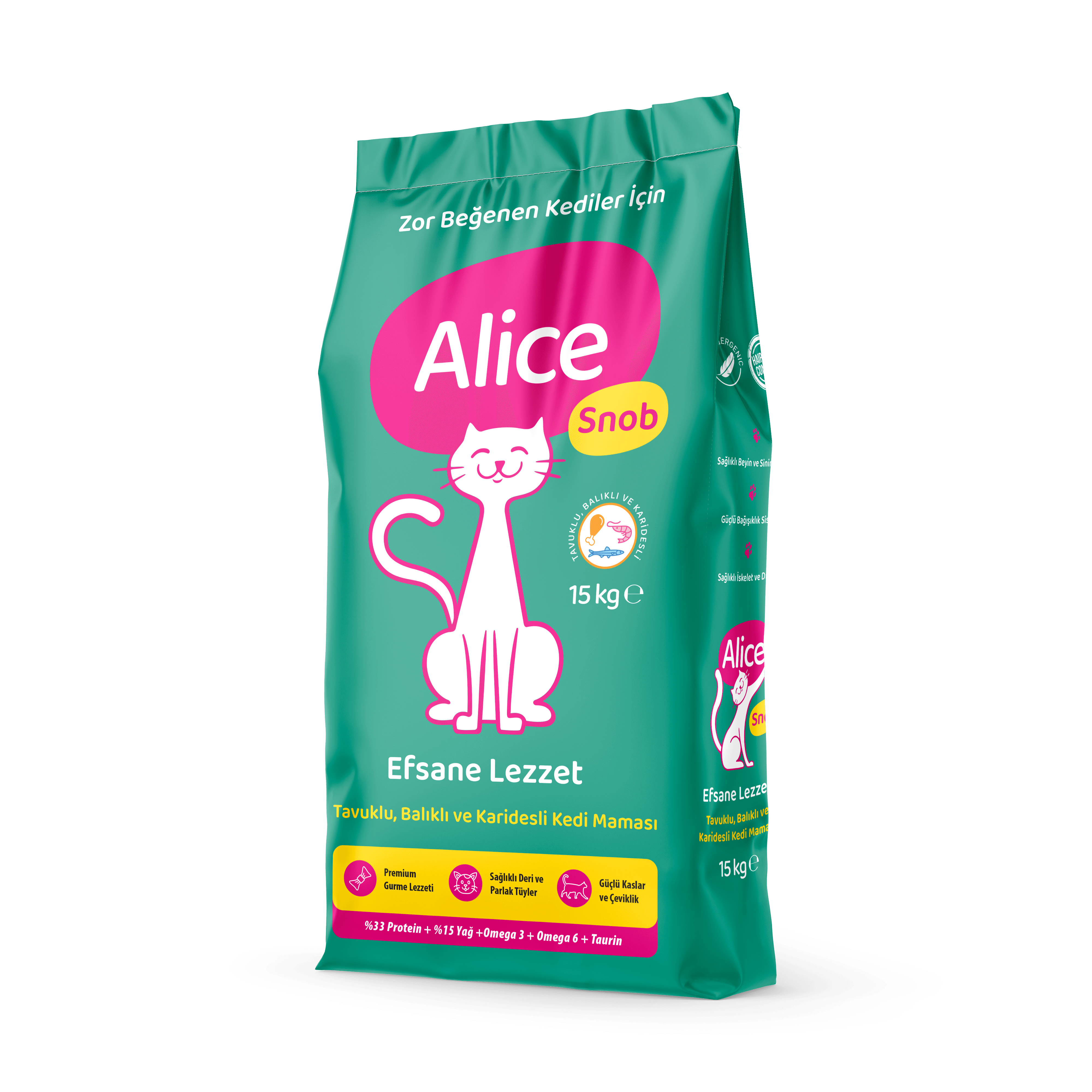- Gurme lezzeti: Alice Snob gurme lezzetiyle zor beğenen kedilerin bile tercih ettiği bir mamadır. Tavuk ve balık tadı, tazeliği, uygun büyüklük ve tanecik yapısı ile kedilerin her zaman favorisidir.