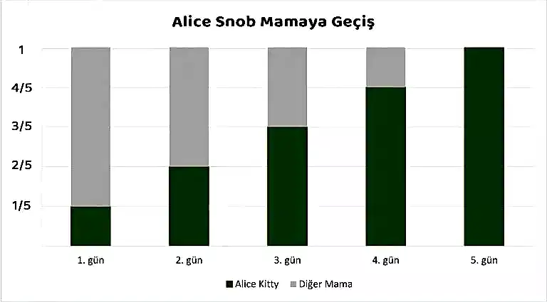 Kedinizin kolaylıkla Alice Snob Tavuklu Balıklı Kedi Mamasına geçebilmesi için 5 günlük bir süre içinde şu an yediği mamaya gittikçe artan oranlarda Alice karıştırmanız tavsiye edilir.